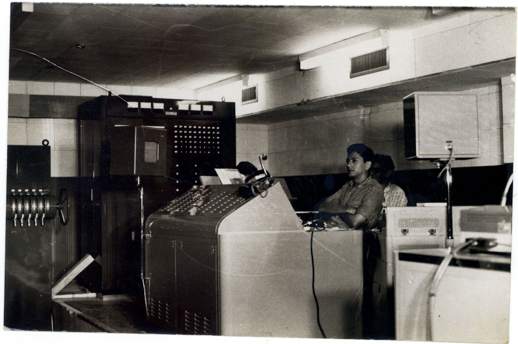 Description: Retrato profissional do interior de um estúdio da TV Universitária, revestido de azulejo, com três luminárias aparentes no teto e tubulação de ar condicionado central. Em sua extensão, é possível visualizar, dois personagens não identificados no centro da foto, o primeiro a frente, de braços cruzados à observar algo, o segundo atrás quase encoberto pelo primeiro personagem e equipamentos. A frente dos personagens, encontra-se um equipamento não identificado de grande porte, em forma de cubo com uma elevação na parte superior, com alguns fios e microfone aparentes. A lado esquerdo dos personagens (olhar do observador), encontra-se um outro equipamento não identificado, escuro e maior, encostado a parede, a frente deste equipamento, tem uma caixa de som elevada com haster. Continuando no lado esquerdo da foto, já no limite da captura, visualiza uma manivela fixa em algo não identificado. No lado direito da foto, próximo aos personagens existe outra caixa de som e mais um equipamento não identificado em primeiro plano.