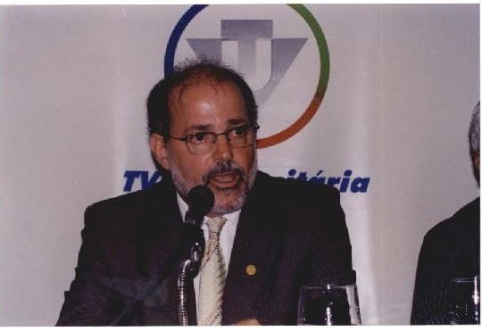 Description: Fotografia em cores de Amaro Lins ao microfone. No verso da foto constam as seguintes informações "Assessoria de com social-UFPE; Nome: Inauguração da nova ilha de edição da TVU; Evento/Pessoa:; Fotógrafo: Marcela Gusmão; 24/03/04