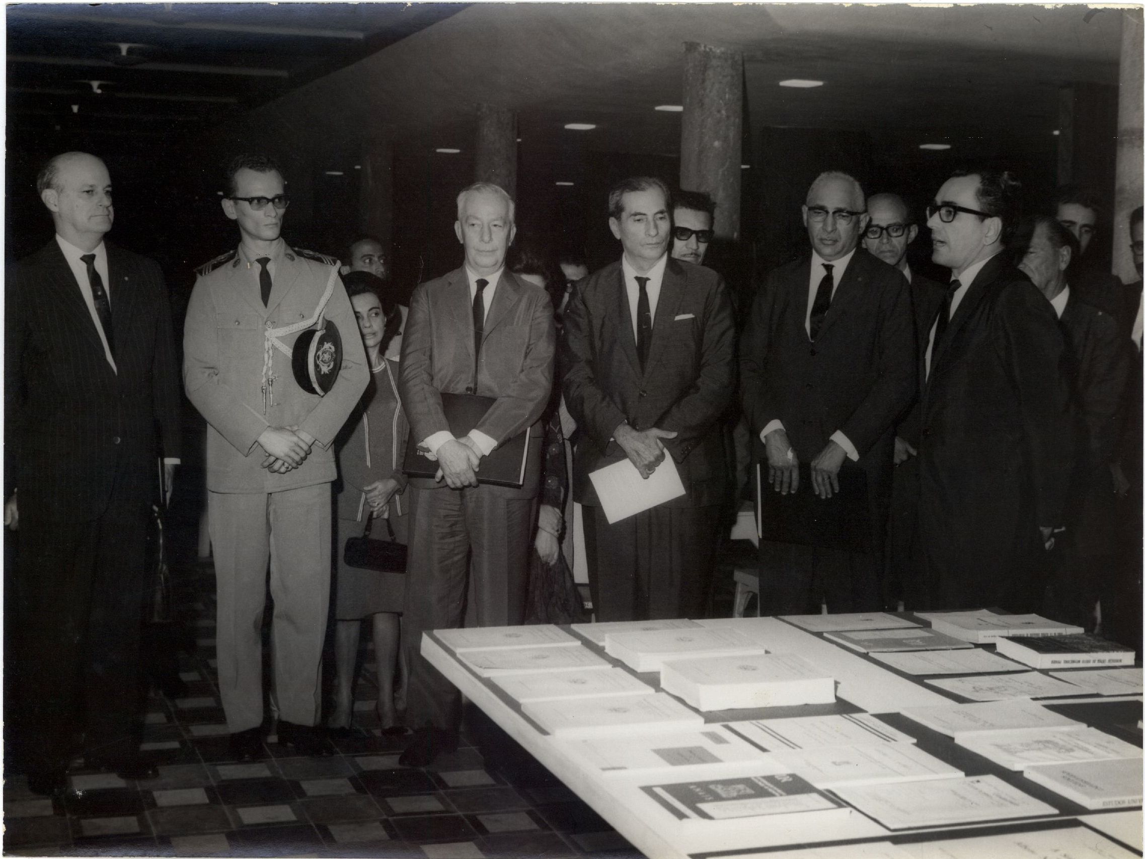 Descrição: Fotografia em preto e branco de diversos homens no lançamento de livros da editora universitária. No verso da foto consta a seguinte informação: ""Editora,100 "
