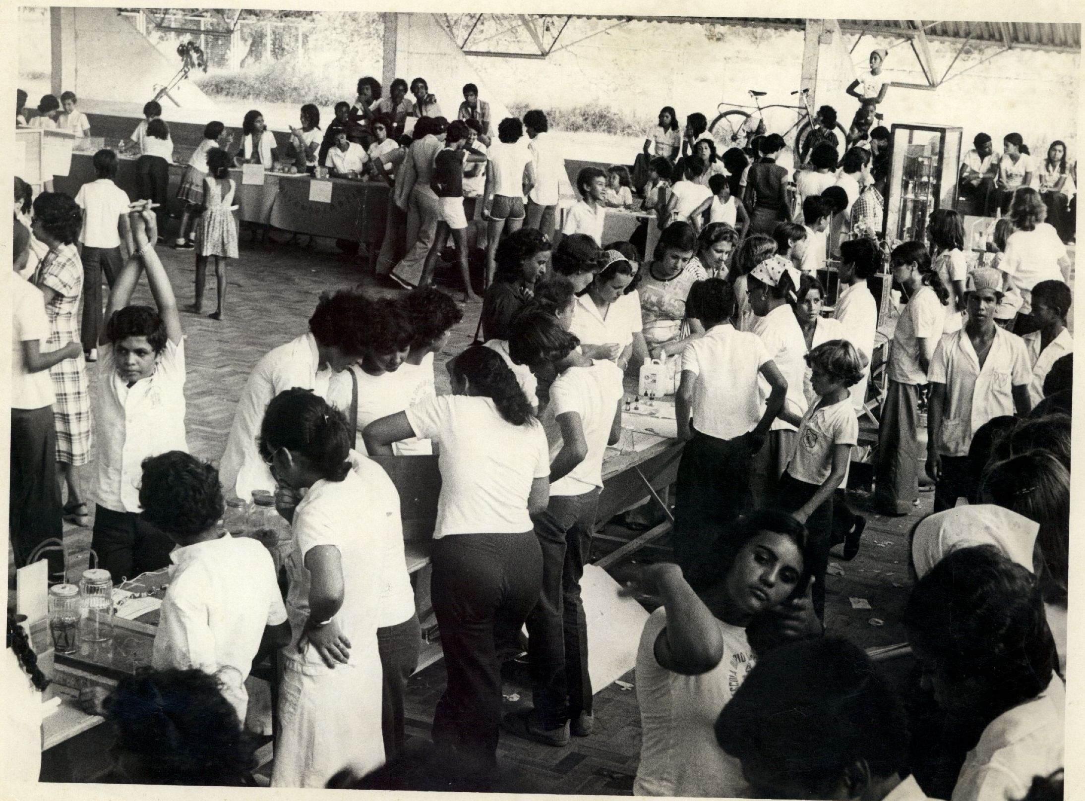 Descrição: Foto em preto e branco onde é possível visualizar várias mesas onde pessoas apresentam seus trabalhos na feira de ciências localizada no Núcleo esportivo da UFPE. No verso da foto consta a seguinte informação: "Feira de Ciencias; local: Nucleo de Educação física da UFPE; 483 - Feira de Ciência - local Nucleo Esportivo da UFPE ". Consta também a informação "NEFD" escrita à lápis.
