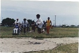 Description: Fotografia em cores onde é possível visualizar a realização de um salto em distância por um atleta, no NEFD. No verso da fotografia constam as seguintes informações “Assessoria de COM SOCIAL – UFPE; Nome: Ed Física e Desporto; Evento/Pessoa: Pronid; Fotógrafo: Maurício Coutinho”; Nov. 2000.”