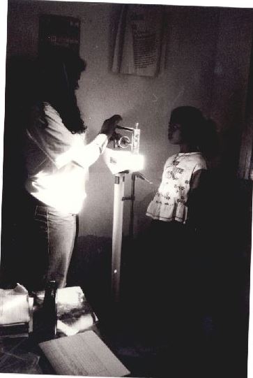 | Description: | Foto em preto e branco onde é possível visualizar uma criança em cima de uma balança antropométrica e uma mulher regulando o equipamento. |