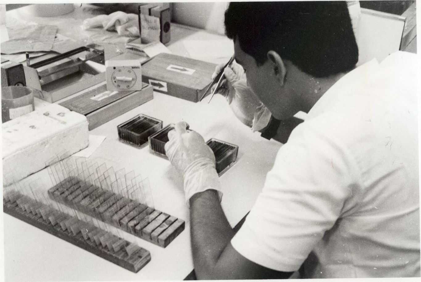 Description: Fotografia em preto e branco de um pesquisador no laboratório do Lika. No verso da foto consta as seguintes informações: "Pesquisadores do lika; [?] filariose.( Escrito a caneta a palavra Lika; 1990)"
