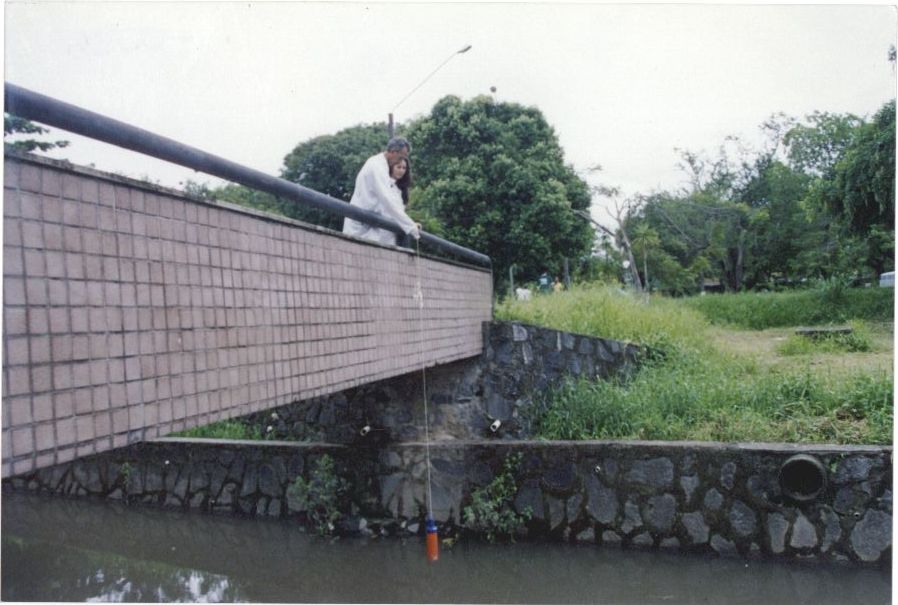 Description: Fotografia em cores de pesquisadores coletando água na área externa da Federal. No verso das fotos consta um adesivo da ASCOM com as seguintes informações: “ASSESSORIA DE COM SOCIAL – UFPE; Nome: Coleta de água no cavouco; Evento/Pessoa: Fotógrafo: Bernardo Cortizo; 12/05/06”