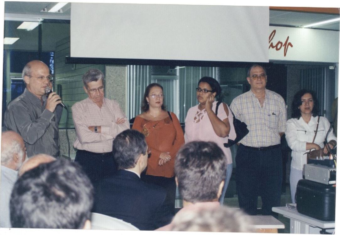 | Description: | Fotografia em cores onde é possível visualizar Décio Fonseca em momento de fala ao microfone e ao seu lado estão cinco pessoas não identificadas. Na imagem aparece a cabeça de algumas pessoas que estão sentadas em frente a Décio e parte de um equipamento de projeção de imagens. No verso da foto consta um adesivo da ASCOM com as seguintes informações: : "Assessoria de Com.Social – UFPE; Nome: Inauguração da praça do NTI; Evento/Pessoa: NTI; Fotógrafo: Marcela Gusmão; Out/03”. |