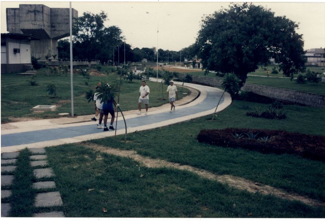 Descrição: Fotografia em cores onde é possível visualizar pessoas caminhando na Pista de Cooper e, ao fundo, tem-se uma visão do Castelo D’água.