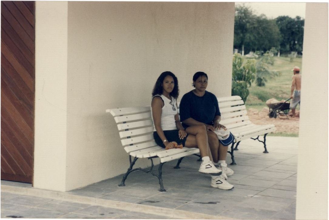 Descrição: | Fotografia em cores onde é possível visualizar duas personalidades não identificadas sentadas em um banco localizado em um ambiente coberto existente na Pisca de Cooper. |