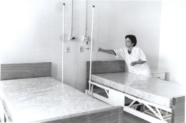 Descrição: Fotografia em preto e branco onde é possível visualizar uma personalidade não identificada no interior de um quarto hospitalar, este localizado no 8ºandar do Hospital das Clínicas.