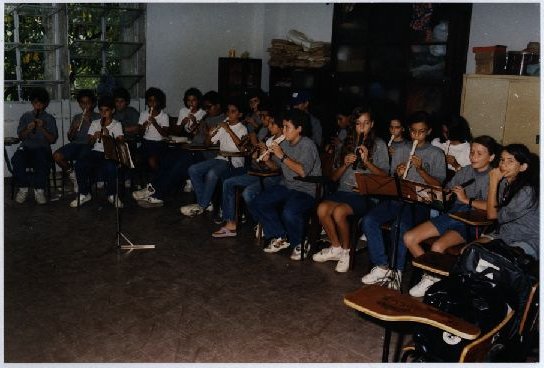 Descrição: Fotografia em cores onde é possível visualizar crianças sentadas atendendo a uma aula de flauta.