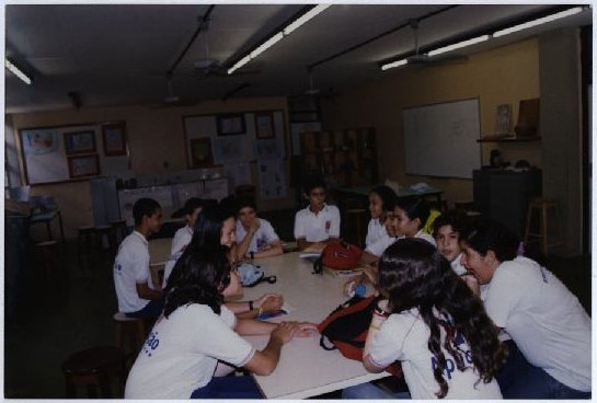 Descrição: | Fotografia em cores onde é possível visualizar um grupo de alunos participando de uma aula ministrada por uma personalidade não identificada. No verso da foto consta um adesivo da ASCOM com as seguintes informações: “Assessoria de Com. Social – UFPE; Nome:; Evento/Pessoa: Alunos - CAP; Fotógrafo: Bernardo Cortijo; 16/02/06”. |