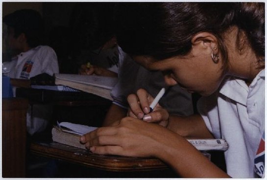 Descrição: | Fotografia em cores onde é possível visualizar uma jovem em momento de estudo em uma aula de matemática. No verso da foto consta um adesivo da ASCOM com as seguintes informações: “Assessoria de Com. Social – UFPE; Nome; Col. Aplicação; Evento/Pessoa: Aula matemática; Fotógrafo: Bárbara Wagner”. |