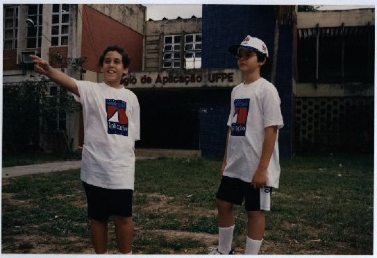 Descrição: | Fotografia em cores de dois alunos do CAP na frente da instituição de ensino. |