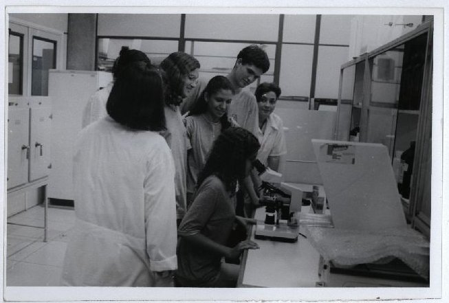 Descrição: | Fotografia em preto e branco onde é possível visualizar jovens no interior de um laboratório, onde um dos jovens utiliza um microscópio; no laboratório há a presença de duas personalidades não identificadas, estas vestindo jaleco. |