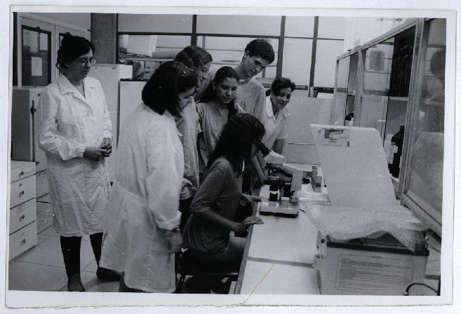 Descrição: | Fotografia em preto e branco onde é possível visualizar jovens no interior de um laboratório, onde um dos jovens utiliza um microscópio; no laboratório há a presença de duas personalidades não identificadas, estas vestindo jaleco. |