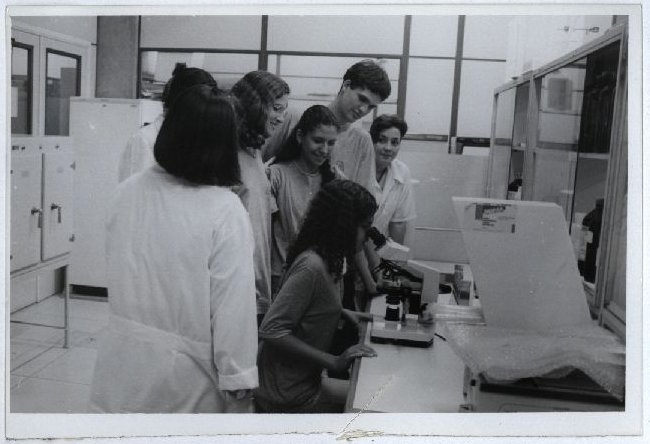 Descrição: | Fotografia em preto e branco onde é possível visualizar jovens no interior de um laboratório, onde um dos jovens utiliza um microscópio; no laboratório há a presença de duas personalidades não identificadas, estas vestindo jaleco. |