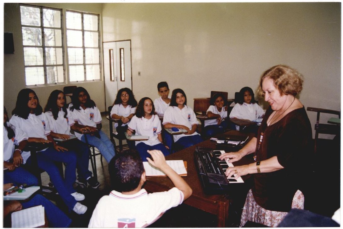 Descrição: | Fotografia em cores que registra o interior de uma sala de aula, sendo possível visualizar diversos alunos com fardamento do CAP e uma personalidade não identificada que se encontra tocando um teclado eletrônico. |