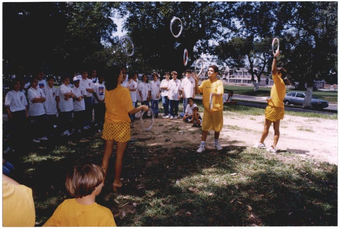 Descrição: | Fotografia em cores de alunos exercitando a arte circense com Aros de Malabares na área externa do CAP, além disso, existem outros alunos de farda observando essa movimentação. |