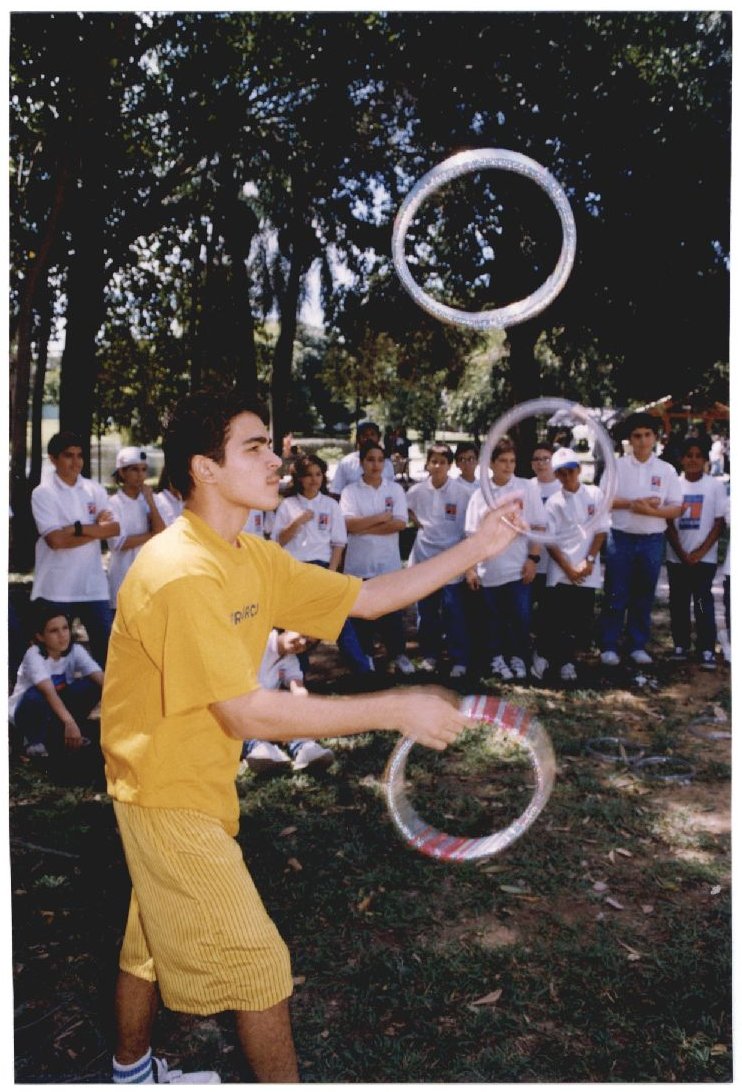 Descrição: | Fotografia em cores de alunos exercitando a arte circense com Aros de Malabares na área externa do CAP, além disso, existem outros alunos de farda observando essa movimentação. |