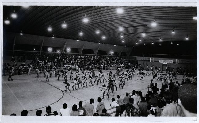 Descrição: | Fotografia em preto e branco de evento realizado na quadra esportiva do CAP. No verso da foto consta a seguinte informação à caneta: “Quadra do Cl. De Aplicação |