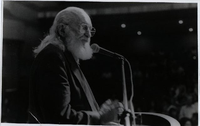 Título: | Paulo Freire fala ao microfone em evento não identificado |