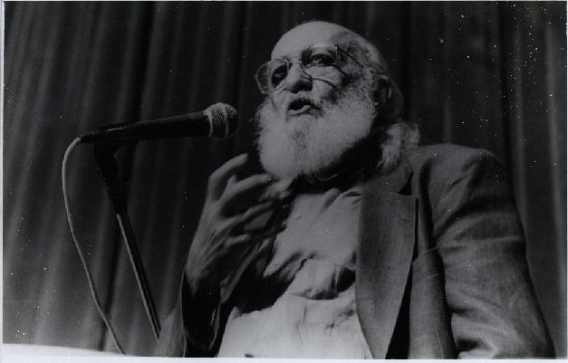 Descrição: | Fotografia em preto e branco onde é possível visualizar Paulo Freire em momento de fala ao microfone. |