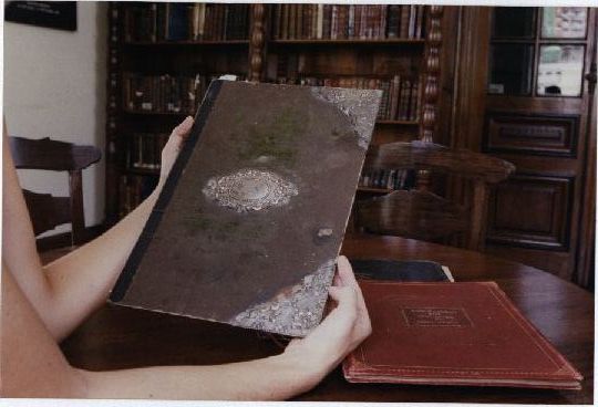 | Description: | Fotografia em cores onde é possível visualizar mão que seguram um livro com a capa danificada, livros fechados sobre uma mesa. No fundo da imagem aparem cadeiras e uma estante com livros. No verso da foto consta um adesivo da ASCOM com a seguinte informação: “Assessoria de Com. Social – UFPE; Nome: Fac. Direito; Evento/Pessoa: Acervo Livros Raros; Fotógrafo: Bárbara Wagner; 13.03.02”. |