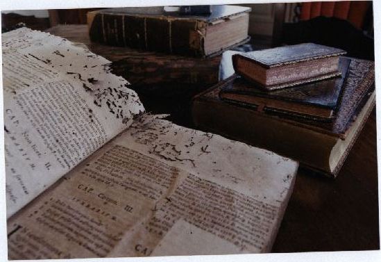 | Descripción : | Fotografia em cores onde é possível visualizar livros sobre à mesa estando um deles aberto e com páginas danificadas. No verso da foto consta um adesivo da ASCOM com a seguinte informação: “Assessoria de Com. Social – UFPE; Nome: Fac. Direito; Evento/Pessoa: Acervo Livros Raros; Fotógrafo: Bárbara Wagner; 13.03.02”. |