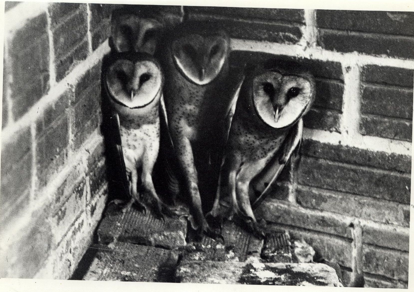 Description: Fotografia em preto e branco de corujas utilizadas em uma reportagem. No verso da foto consta a seguinte informação escrita a caneta “Reportagem sobre coruja”