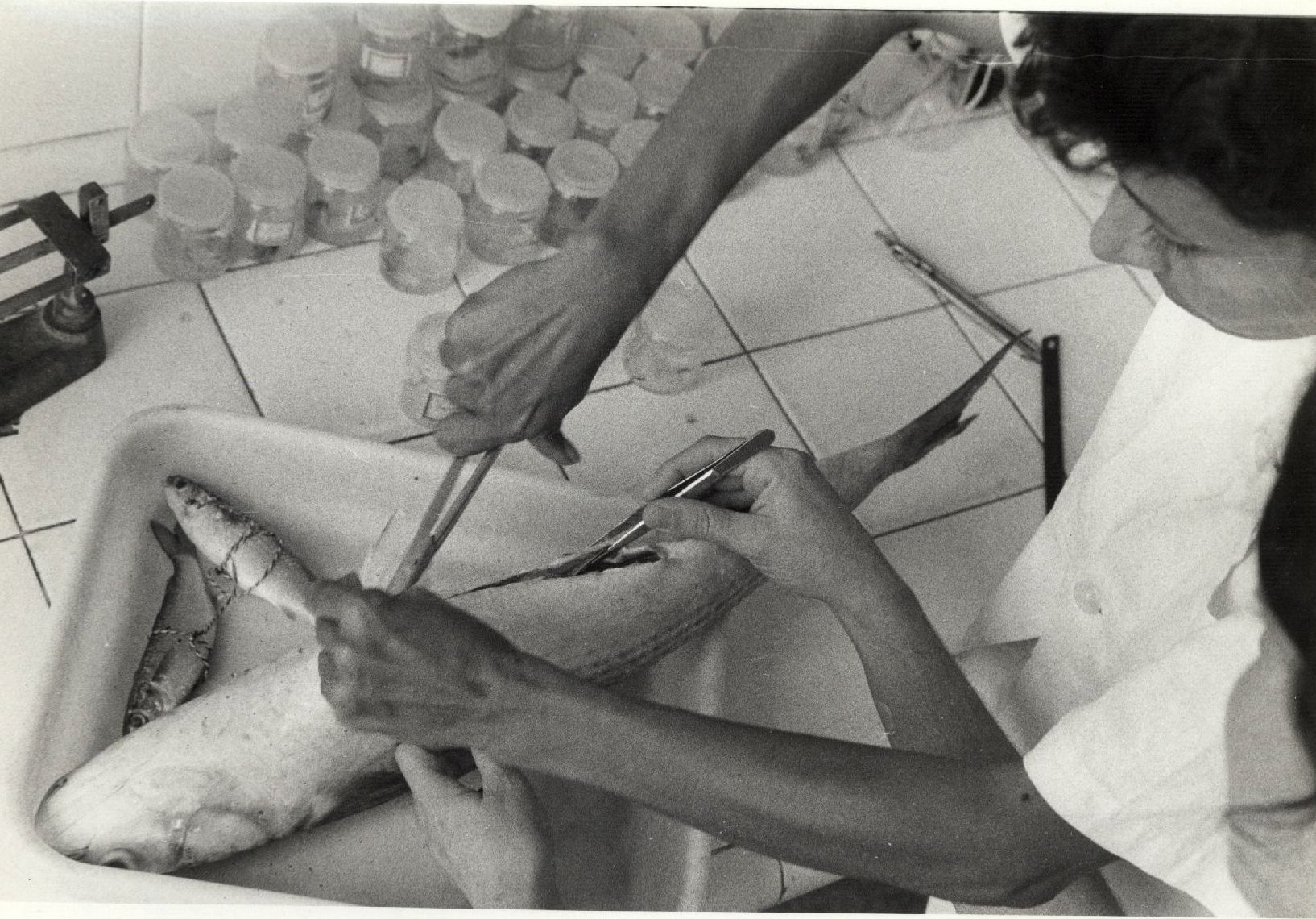 | Description: | Fotografia em preto e branco de pesquisadores abrindo um peixe em laboratório. No verso da foto consta a seguinte informação escrita a caneta “Ecologia” |