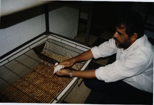 Descrição: | Fotografia em cores de um homem segurando um rato de laboratório dentro de uma gaiola. No verso da foto constam as seguintes informações a caneta: “Biotérios – Outros” |