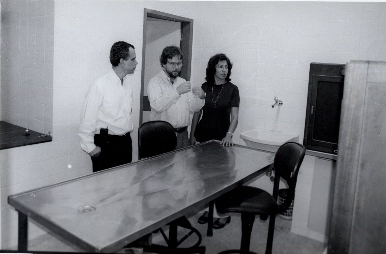 Description: Fotografia em preto e branco onde é possível visualizar três personalidades não identificadas no interior de um aparente laboratório.