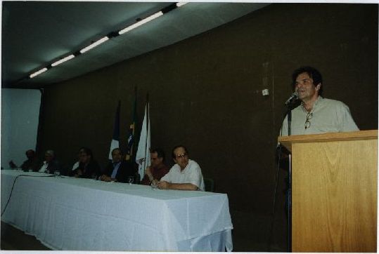 Description: Fotografia de homem ao microfone em evento de Química Fundamental. No verso da foto consta um adesivo da ASCOM com a seguinte informação: “Assessoria de Com. Social – UFPE; Nome: Química Fundamental (DQF); Evento/Pessoa: Aniver.20 anos; Fotógrafo: Passarinho; 06/12/02”.