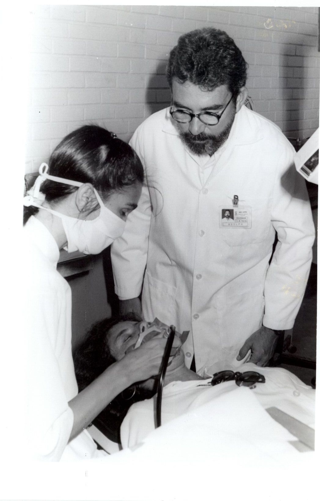 | Descripción : | Fotografia em preto e branco onde é possível visualizar uma paciente recebendo tratamento odontológico de dois profissionais da área. |