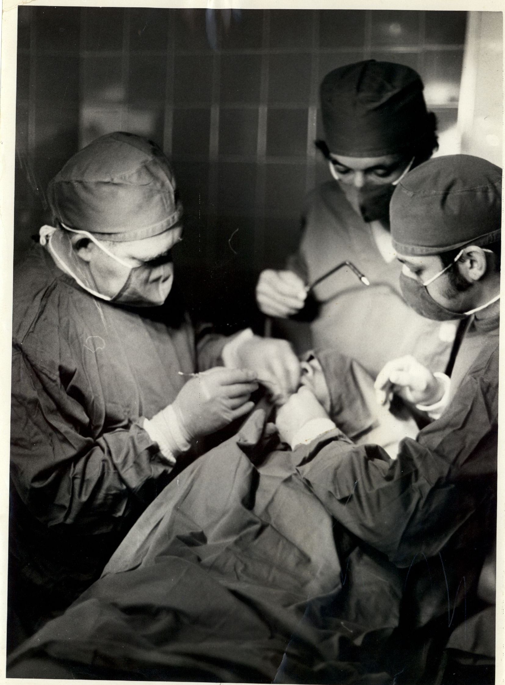 Descrição: Fotografia em preto e branco onde é possível visualizar profissionais de odontologia no interior de um consultório odontológico realizando um procedimento cirúrgico bucal.