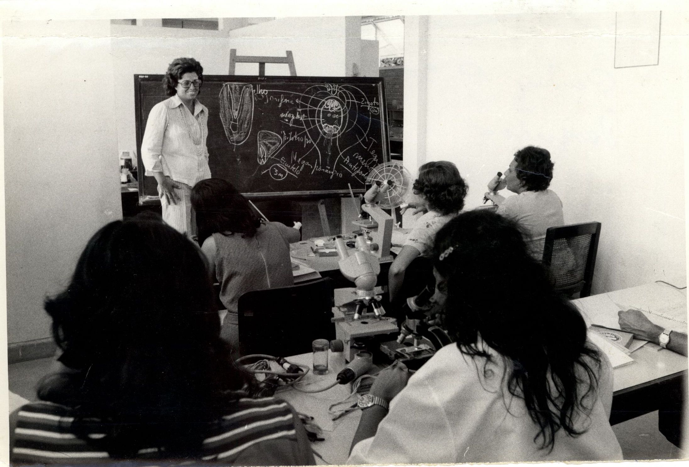 Descrição: Fotografia em preto e branco onde é possível visualizar Aluno e professores em sala de aula com alguns equipamento laboratoriais. No verso da fotografia encontram-se as seguintes informações:"centro C. saúde, pesqueira; 13\2 cent. De largura, D. 10 J.CI”.