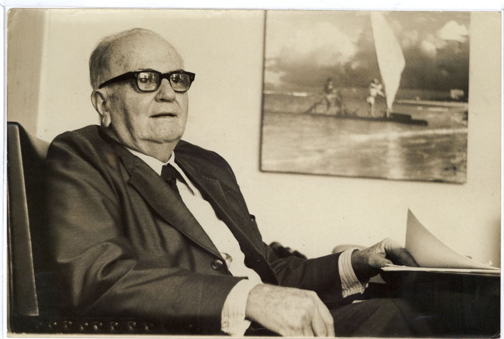 Descrição: Fotografia em preto e branco onde é possível visualizar do Professor Nelson Chaves sendo entrevistado pelo repórter Angelo do Jornal Universitário. No verso da foto encontram-se as seguintes informações: "centro C. saúde, assunto = entrevista c prof. Nelson Chavês, reporter = Angelo; D-20;8\2 cent. de largura, K - 20, JU, Prof. Nelson chaves”.