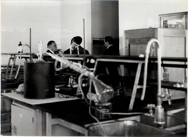 Descrição: | Fotografia em preto e branco onde é possível visualizar o Presidente Castelo Branco, Reitor Murilo Guimarães e outras personalidades em visita a um laboratório. |