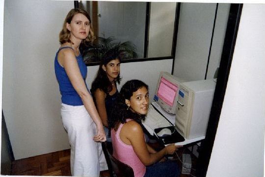 | Title: | Denise de Engenharia da Produção e alunas em frente a um computador de mesa |