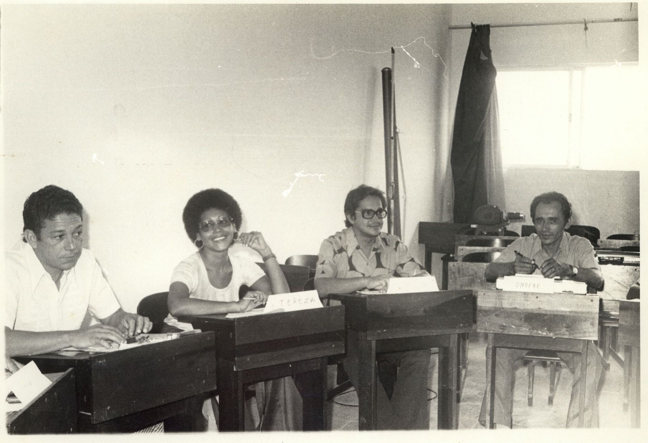 | Description: | Fotografia em preto e branco onde é possível visualizar pessoas sentadas em carteira em sala de aula. Nas carteiras tem placas com nomes. Na frente da segunda pessoa da esquerda para direita, consta escrito: “Tereza” e na placa da quarta pessoa consta: “Onofre”. No verso da foto consta a seguinte informação escrita à caneta: “Geociências”. Nas placas da segunda pessoa da esquerda para direita, consta escrito: “Tereza” e na placa da quarta pessoa consta: “Onofre”. |