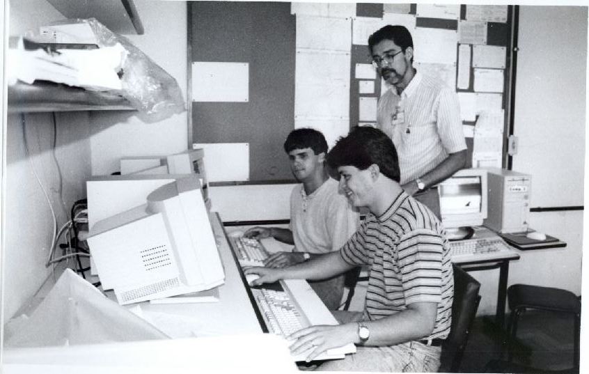 Description: Fotografia em preto e branco onde é possível ver três homens não identificados em laboratório de informática. Há na coleção outras fotografias com conteúdo similar e encontram-se sob a indicação de localização 3A, foto 07. O pesquisador que tiver interesse nestas fotografias deve entrar em contato com o Memorial Denis Bernardes através do e-mail: mdb@ufpe.br