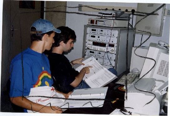 Description: Fotografia em cores onde é possível visualizar homens não identificados em laboratório de Física no CTG. No verso da foto consta um adesivo da ASCOM com a seguinte informação: "Assessoria de Comunicação Social – UFPE Nome: CTG – Física; Evento/Pessoa: Laboratório; Fotógrafo: Passarinho; Set. 2001”.