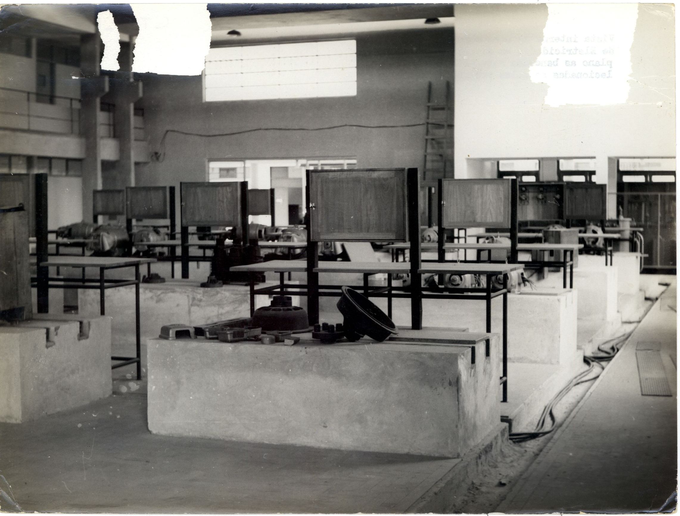 | Description: | Fotografia em preto e branco onde é possível visualizar Vista interna do Laboratório de Eletricidade. No verso da foto consta a seguinte informação datilografada: “Vista interna do Laboratório de Eletricidade, em primeiro plano as bancadas onde são lecionadas as aulas práticas”. |