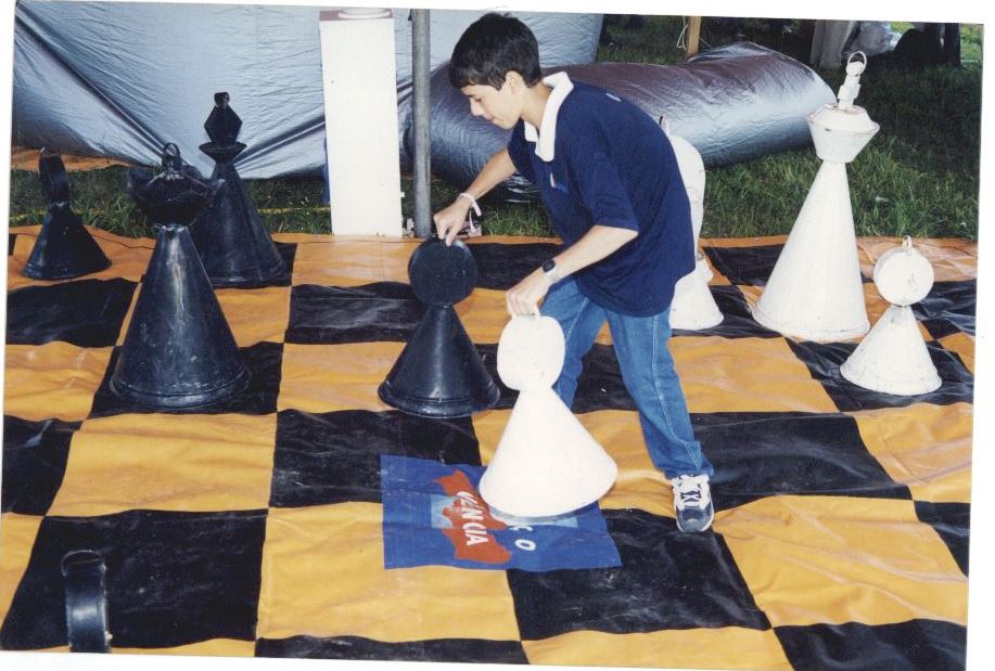 Descripción : Fotografia em cores onde é possível visualizar criança jogando xadrez gigante. No verso da foto consta um adesivo da ASCOM com a seguinte informação: "Vivendo o campus- 2002". E consta um adesivo com a informação: "Assessoria de Com. Social - UFPE; Nome: Vivendo o campus; Evento / pessoa: Xadrez gigante; Set. 2000".