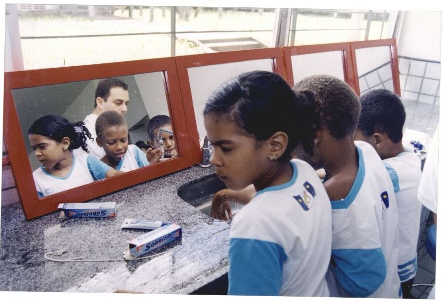 | Título: | Crianças escovando os dentes em frente a espelhos |