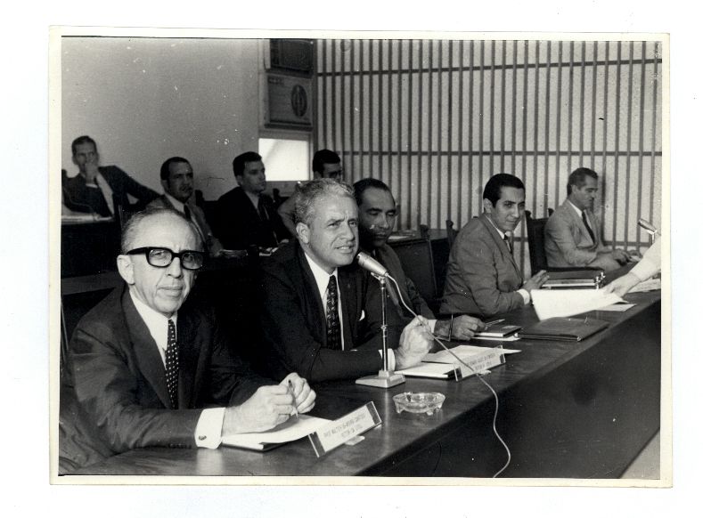 | Description: | Fotografia em preto e branco onde é possível visualizar homem não identificado em momento de fala em mesa diretiva ao lado de homens também não identificados. |