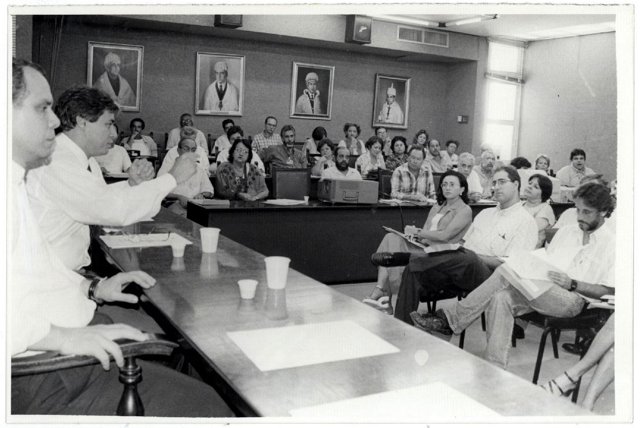| Description: | Fotografia em preto e branco composta de aproximadamente 30 pessoas. Do lado esquerdo é possível observar o reitor Mozart Neves Ramos gesticulando com as mãos, enquanto várias pessoas não identificadas assistem a sua fala. No verso da fotografia 943 há a seguinte informação escrita à caneta "Proensio 99". |