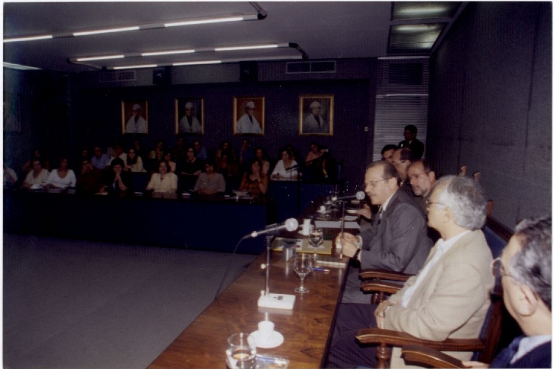 Description: Fotografia composta de aproximadamente 30 pessoas. Em primeiro plano, nota-se a mesa composta por 6 homens, dentre eles o Ministro Tarso Genro ao centro da mesa discursando e o então Reitor Amaro Henrique Pessoa Lins ao seu lado. Ao fundo um conjunto de aproximadamente 25 pessoas acompanham a fala do Ministro. No verso da fotografia 602, há as seguintes informações escritas na etiqueta: "Visita do Ministro Tarso Genro; Passarinho" e "19/02/04" escrito à caneta direto no verso da fotografia.