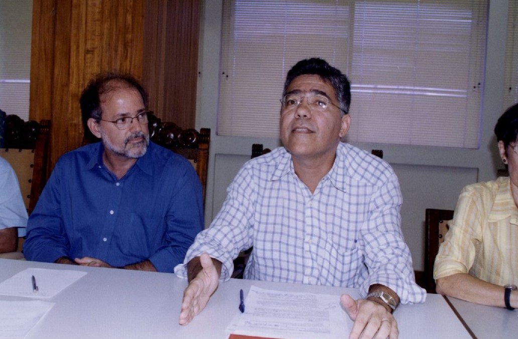 | Description: | Imagem de quatro pessoas sentadas em frente de uma mesa, aparentemente como se estivessem em frente ao público. Duas pessoas, as que estão nos cantos esquerdo e direito, aparentemente um homem e uma mulher, estão cortados na fotografia. As duas pessoas posicionadas ao centro, dois homens, o que está mais ao lado direito está falando, enquanto o outro, mais ao lado esquerdo, está prestando atenção. Possui a seguinte inscrição: " Gabinete, Apresentação dos novos, Pró Reitores, Passarinho, Out/ 03". |