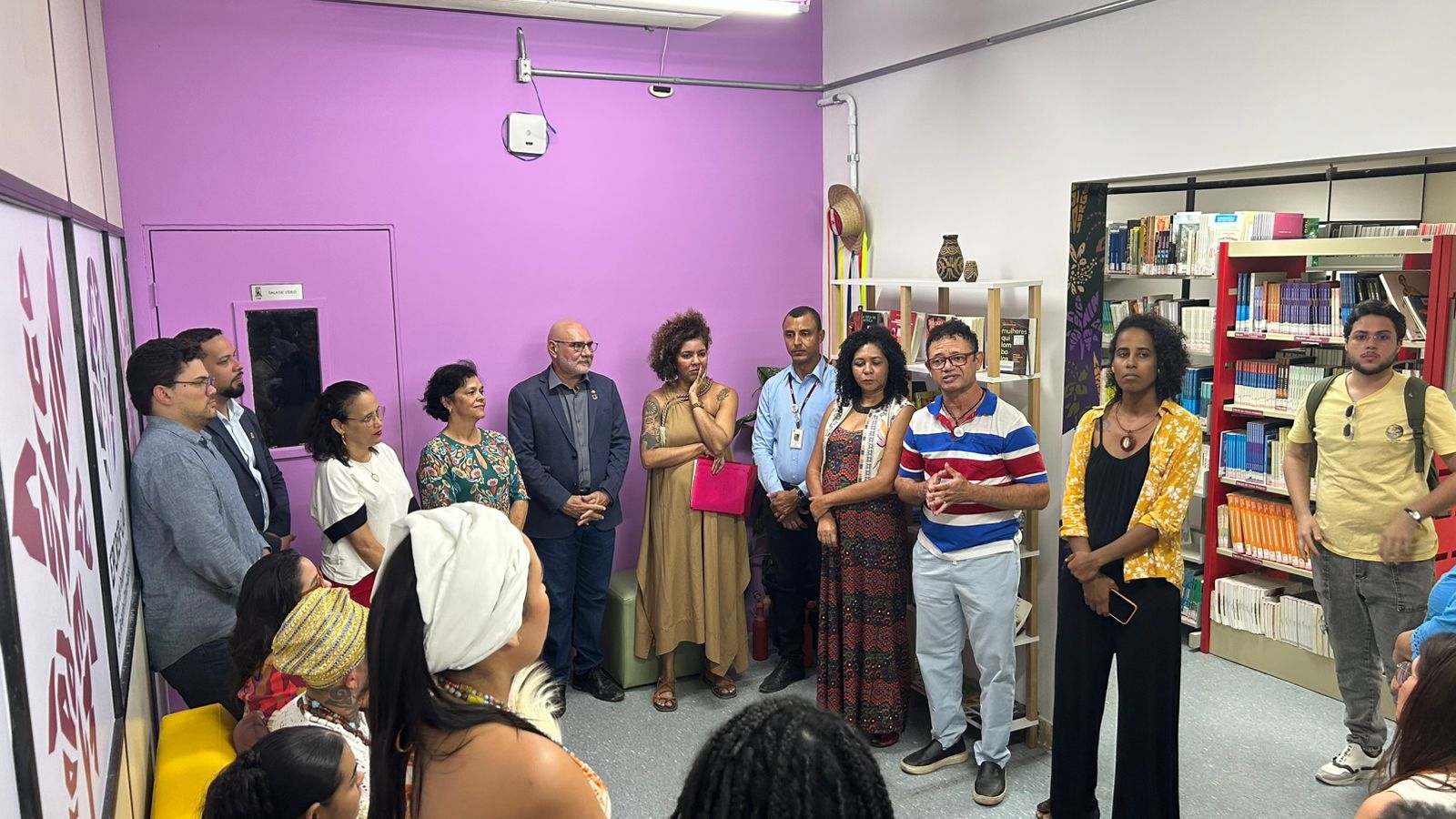 Resumen : Inauguração do Espaço de Pesquisa e Cultura das Relações Étnico-Raciais (EPCRER) na Biblioteca Setorial do CAV. Da esquerda para direita temos Michelle Galindo (vice-diretora do CAV), Giane da Paz (coordenadora da Biblioteca do CAV) Alfredo Gomes (Reitor da UFPE) Rosely Tavares (professora o CAV da disciplina de Estudos Étnico-Raciais), José Antônio dos Santos (Diretor do CAV), Ceça Reis (Pró-Reitora de Extensão da UFPE) , Adilson dos Ramos (Bibliotecário e Gestor do EPCRER- Recife) e Amanda Ganimo do Nascimento (Diretora de Ações Afirmativas).