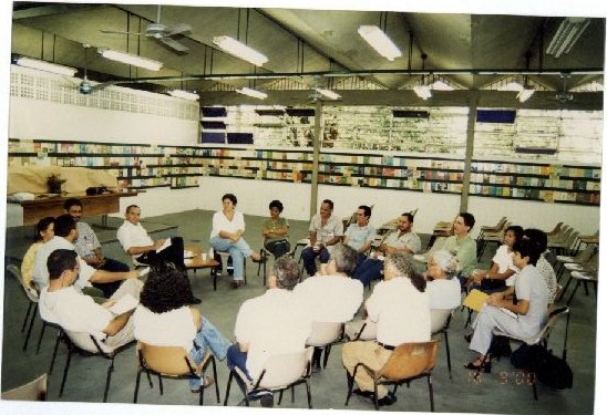 Descrição: | Fotografia em cores de diversas pessoas sentadas em cadeiras, dentro de uma sala, rodeada por livros. : No verso da foto contém a seguinte informação escrita à caneta: “Editora; 01 – 10; alt: 8.6; larg: 12.2”. |